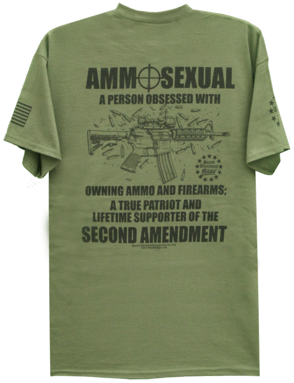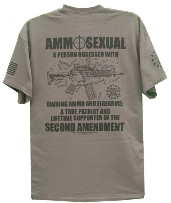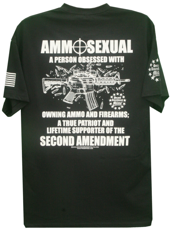 This outrageous T-Shirt is sure to get a lot of attention! We can bet than you never considered that your obsession with Guns and Ammo as well as your passion for the Second Amendment would lead you to be called an AmmoSexual! But it’s not a bad thing, and as Jerry Seinfeld might say: “Not that there’s anything wrong with that”! This T-Shirt defines an AmmoSexual as: “A PERSON OBSESSED WITH OWNING AMMO AND FIREARMS; A TRUE PATRIOT AND LIFETIME SUPPORTER OF THE SECOND AMENDMENT”. Enjoy wearing this outrageous T-Shirt, and watch for people’s reaction. This would make a great gag gift to the “Gun Nut” in your life.