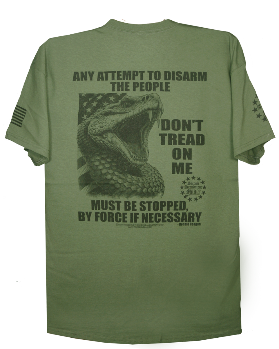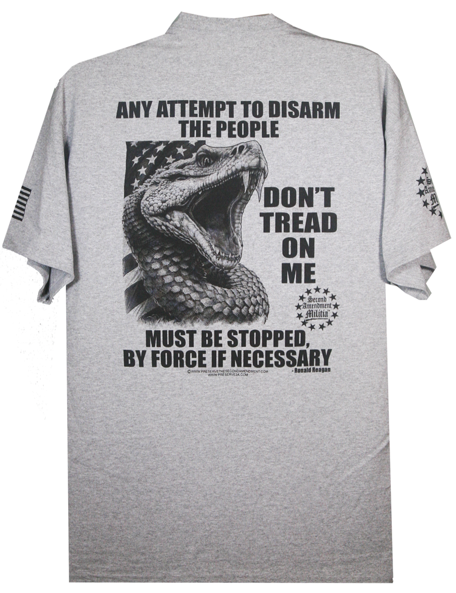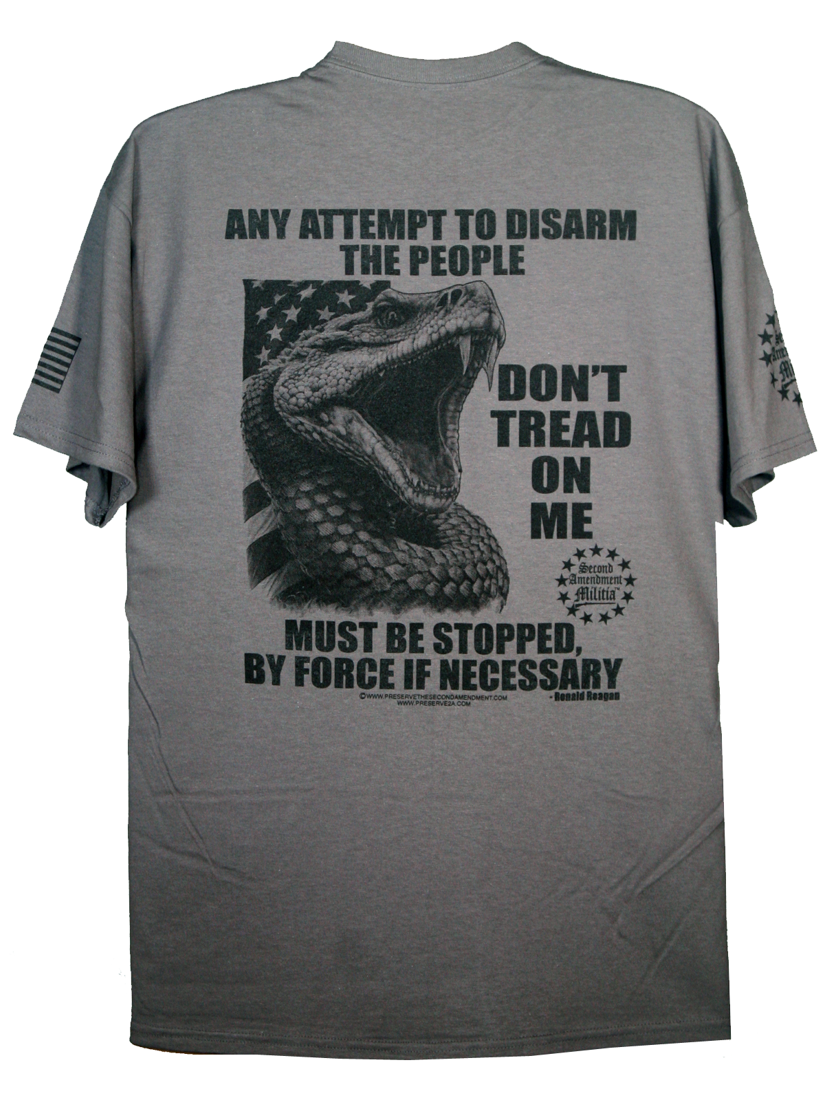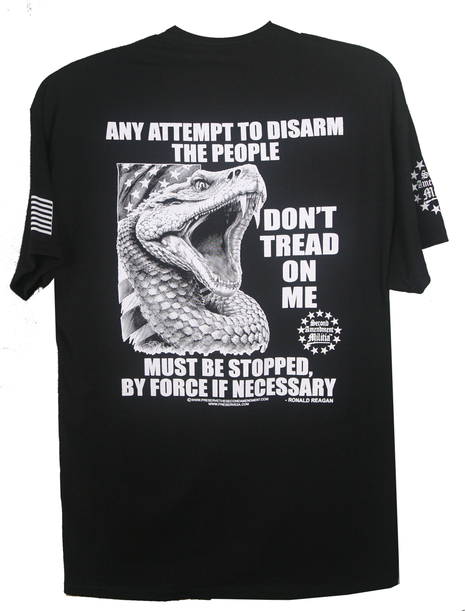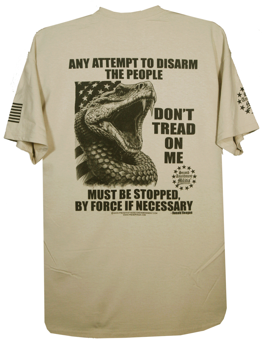 This design features a Timber Rattlesnake with a stars and stripes American Flag backround. This close up original drawing of a timber rattlesnake has his mouth open with his fangs exposed and ready to strike at anyone trying to take The Peoples Second Amendment rights away. The caption says: “ANY ATTEMPT TO DISARM THE PEOPLE MUST BE STOPPED, BY FORCE IF NECESSARY, DON’T TREAD ON ME”.