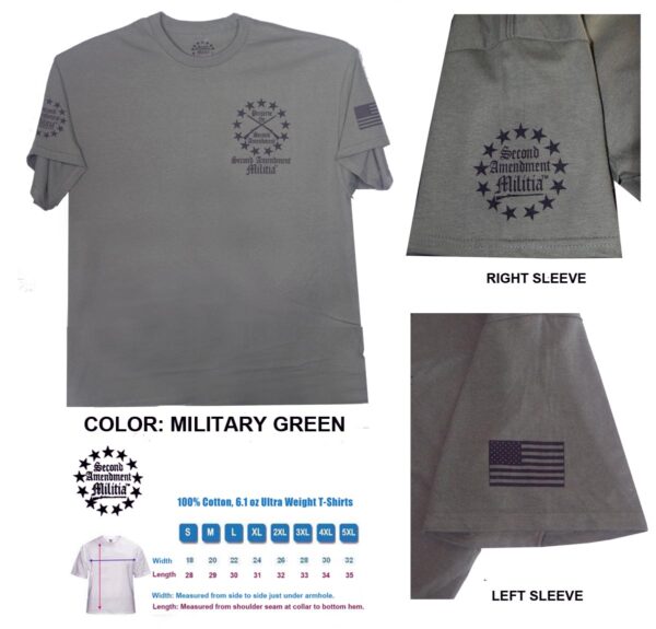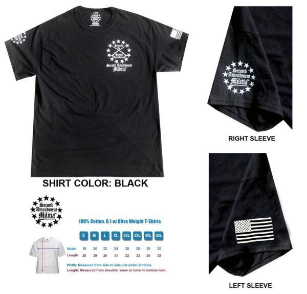 - Printed in 4 locations: Front left chest, back, and both sleeves, plus a printed neck label for comfort and features the Second Amendment Militia logo.