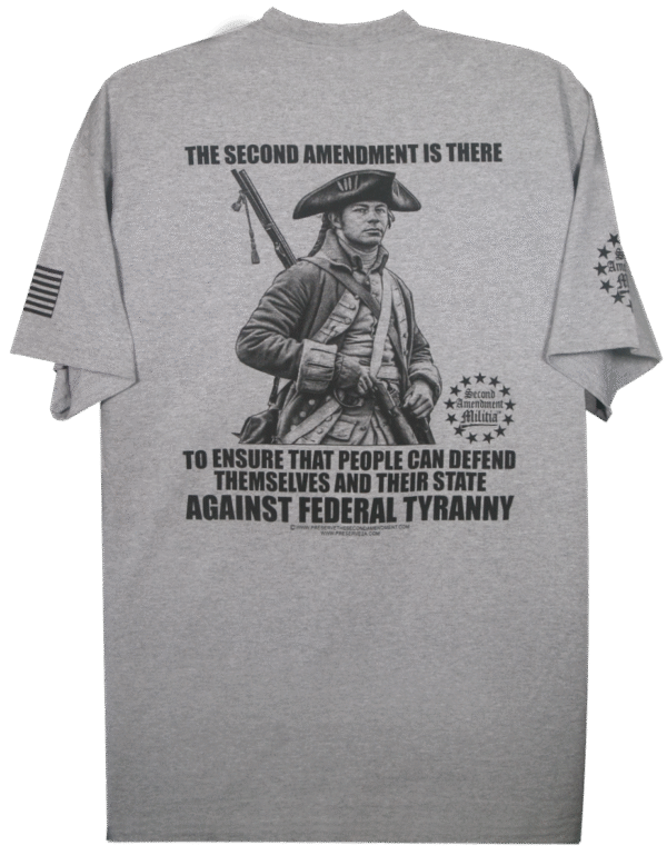 - PRINTED IN FOUR LOCATIONS: FRONT LEFT CHEST, BACK, AND BOTH SLEEVE. PLUS THERE IS A PRINTED NECK LABEL FOR COMFORT AND FEATURES THE SECOND AMENDMET MILITIA LOGO