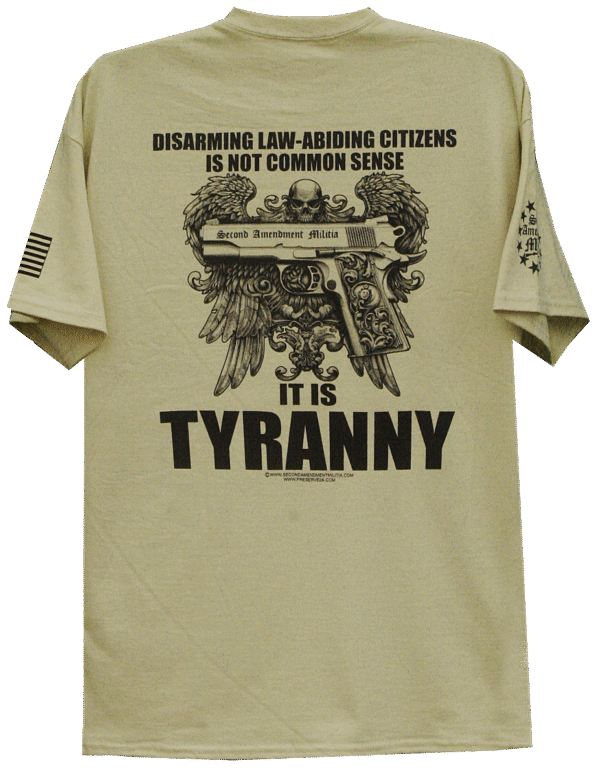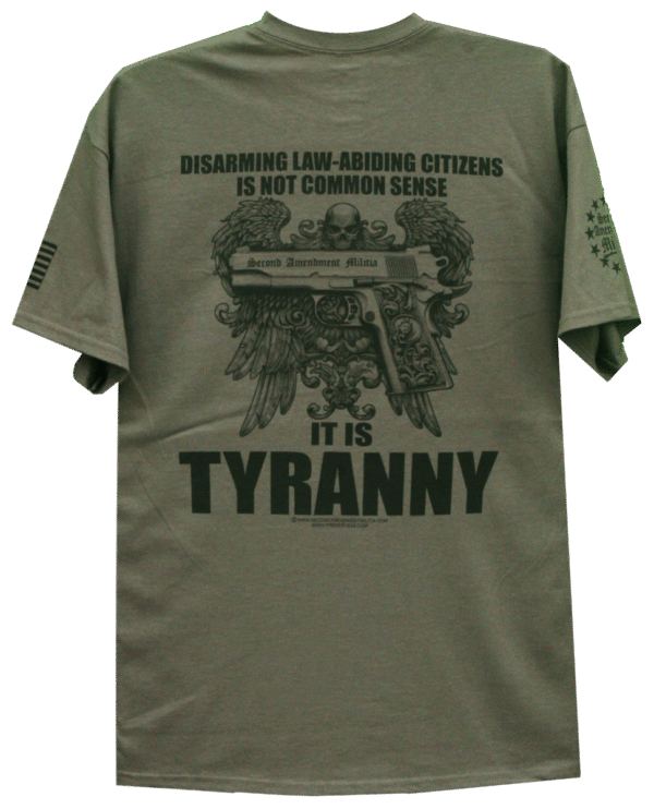 This design features a custom Second Amendment Militia branded .45 caliber automatic pistol, with a highly detailed winged skull backround. The quote: “DISARMING LAW-ABIDING CITIZENS IS NOT COMMON SENSE, IT’S TYRANNY”, is a response the the gun grabbers over-used excuse to “curb”, your Second Amendment rights. They use the “common sense gun laws” term to make it seem like what they ask for are minor changes when in reality it is only the beginning. They will try little by little to take away your Second Amendment rights till they are gone.