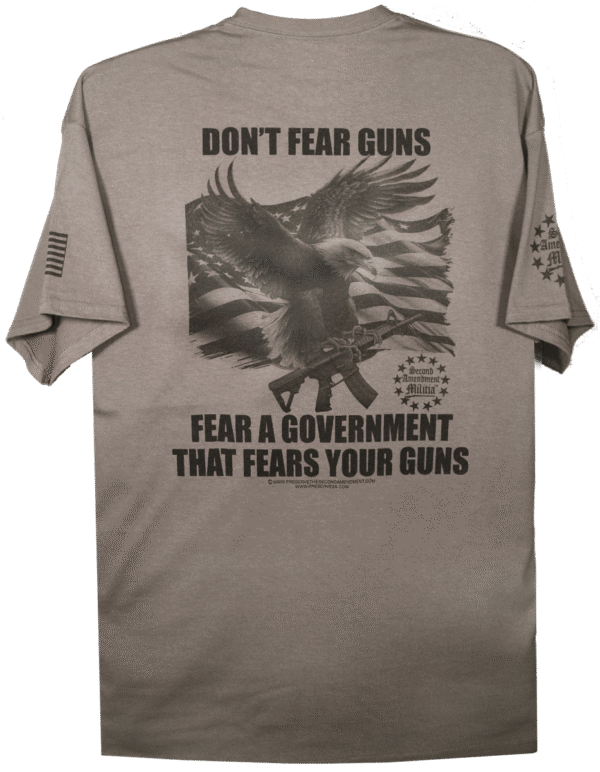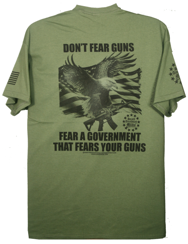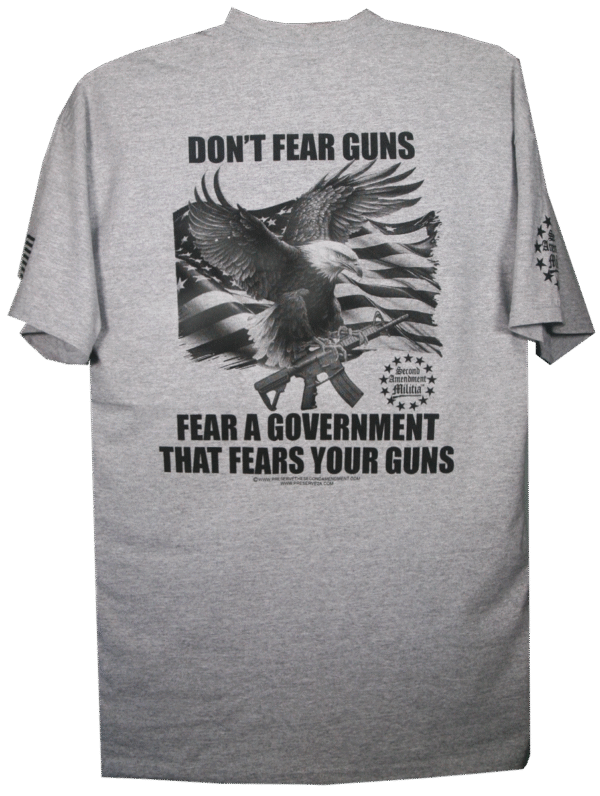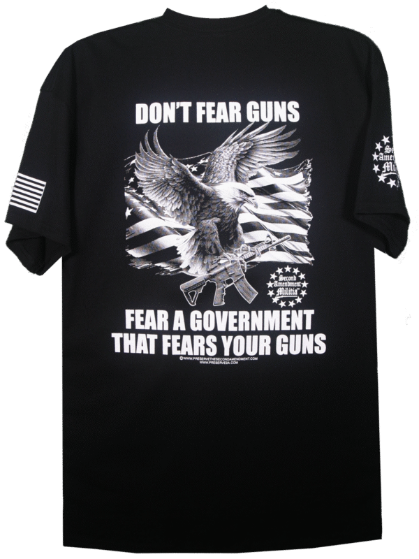 This T-Shirt features an American Bald Eagle in flight carrying an AR Style Rifle in his talons, with an American Flag waving in the backround. The quote: “DON’T FEAR GUNS, FEAR A GOVERMENT THAT FEARS YOUR GUNS”, is a statement that holds as true today as it did during the founding of our great nation. If the government allows the people their liberty, there is nothing that government needs to fear from its people. That means it is a just government. If that government fears your guns then it is commiting injustices, or tyranny against its people and it should fear your guns. The founding fathers were wise enough to include the Second Amendment in the Bill of Rights, and thus it became the Second Amendment of our Constitution. They did this for an important reason. They wanted to provide the people with the means, if necessary, and as a last resort, to overthrow a tyrannical and unjust government. We would be helpless subjects without our right to bear arms.