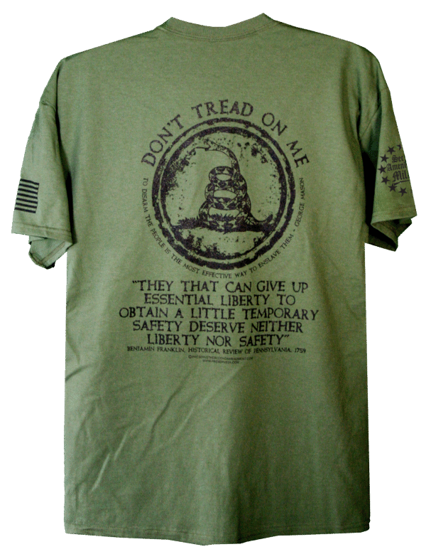 This distressed design features at its center the Gadsden timber rattle snake. Above the circular design are the words: “, Don’t Tread On Me”, and wrapped below the design is a Quote from George Mason which reads: “To Disarm The People Is The Most Effective Way To Enslave Them”