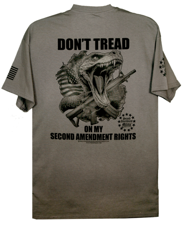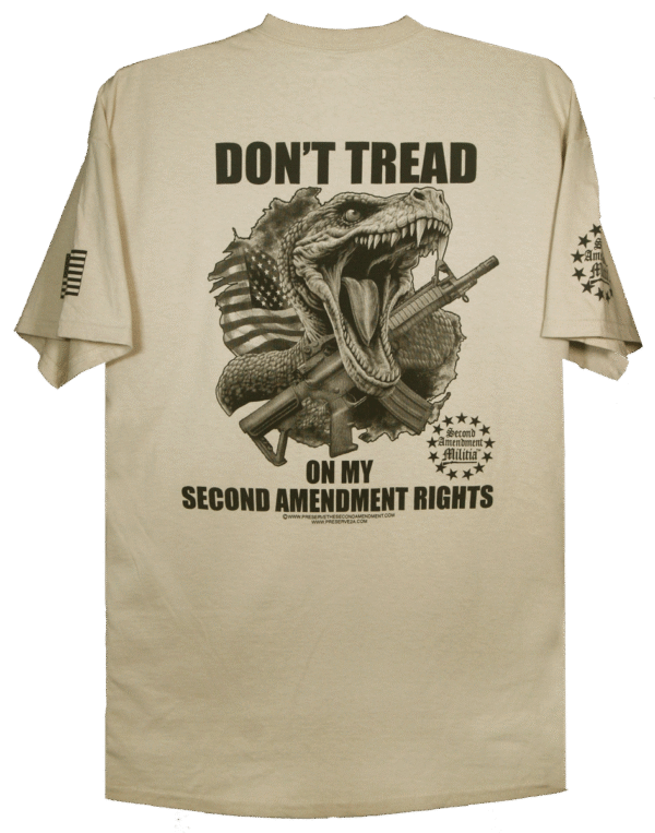 This design features a Timber Rattlesnake and an AR Style rifle with an American flag in the backround. The quote of: “DON’T TREAD ON MY SECOND AMENDMENT RIGHTS”, goes back to the Gadsden flag which featured a coiled timber rattlesnake and the quote: “Don’t Tread On Me”.