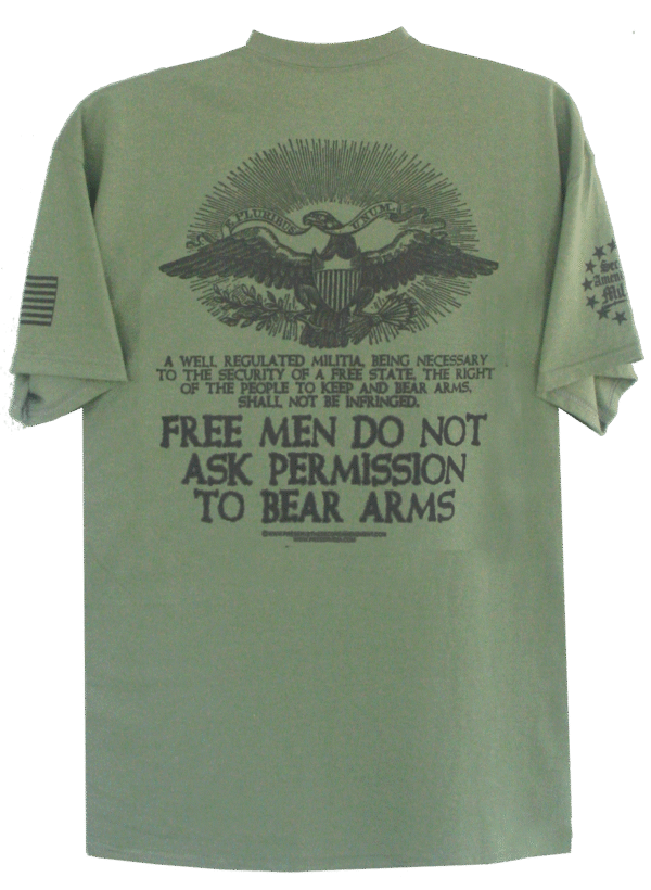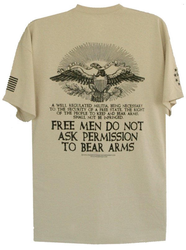 This design features a Revolutionary War period American Bald Eagle with a banner in his beak saying: “E Pluribus Unum (From The Many, One) symbolizing unity amoungst the colonies. Below the graphic are the full 27 words of the Second Amendment, below of which reads: “FREE MEN DO NOT ASK PERMISSION TO BEAR ARMS”. We do not need permission because this right is guaranteed by the Second Amendment. We are citizens and not sunjects, and as such can demand our Second Amendment rights which are guaranteed by the Constitution, and not subject to the whims of a corrupt Government that wishes to deny us of these rights.