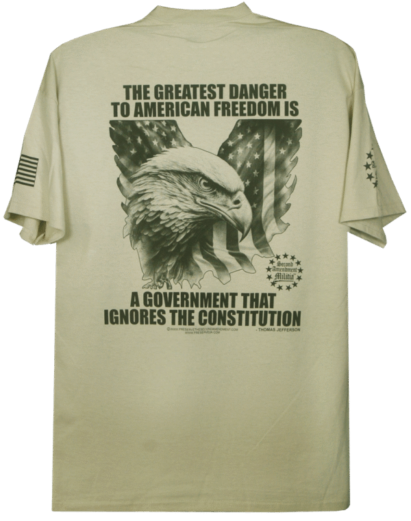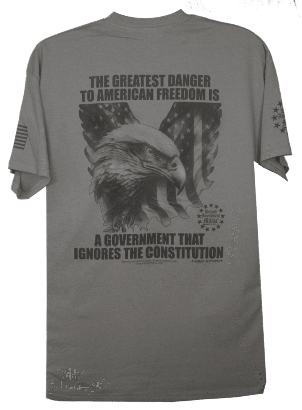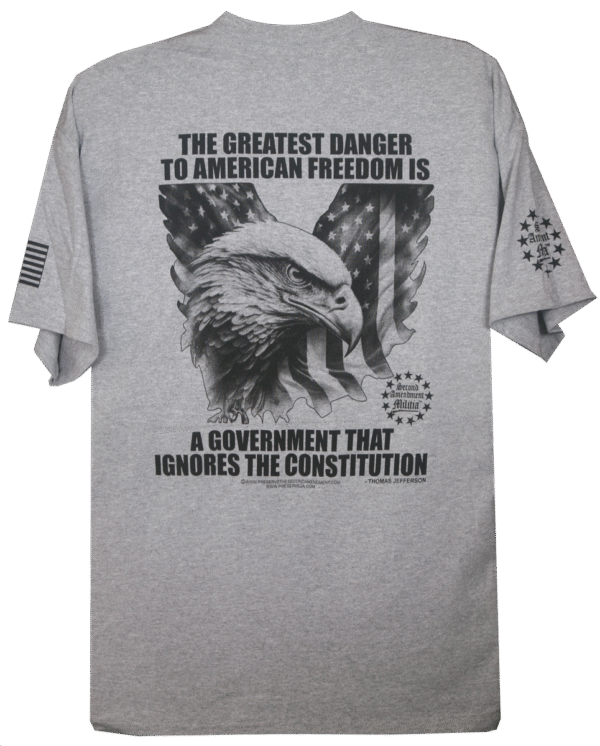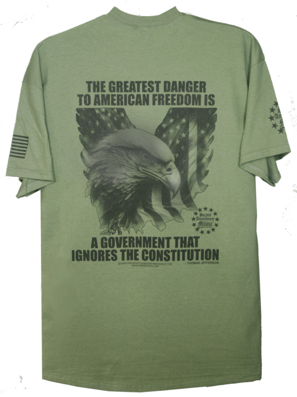 This design features a Large Bald Eagle Head wuth a graphic American Flag backround. Above the graphic it reads: The Greatest Danger To American Freedom is”, and below the graphic it reads: “A Government Which Ignores The Constitution”. The type of government which Ignores the Constitution is a Tyrannical Government. That type of government cannot be tolerated, must at all costs be voted out of power. If they ban voting, then the people must exercise their Second Amendment rights and put them out of power by any means necessary.