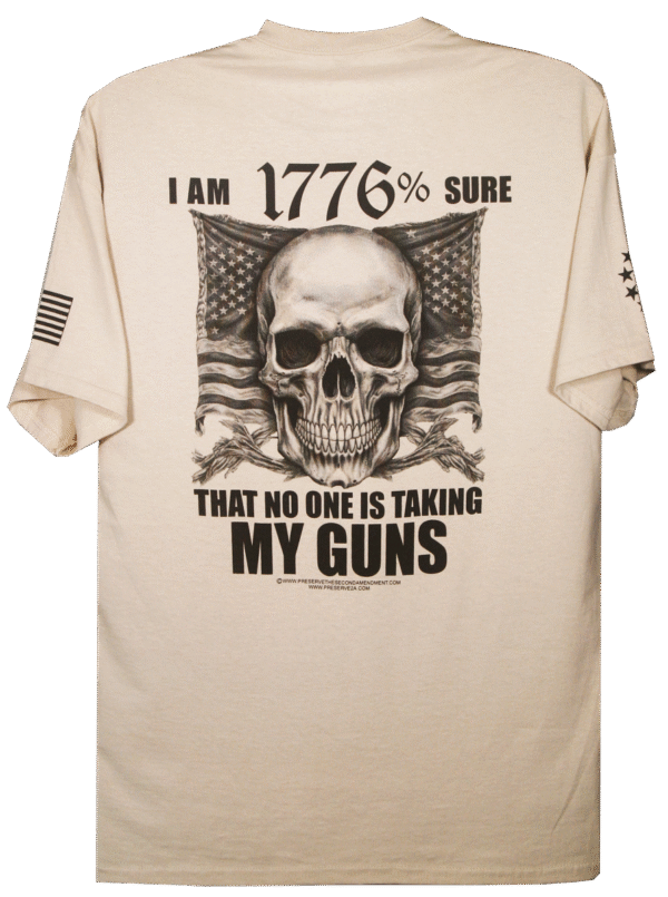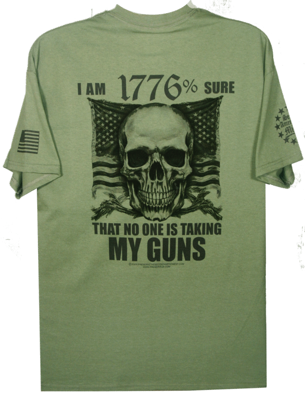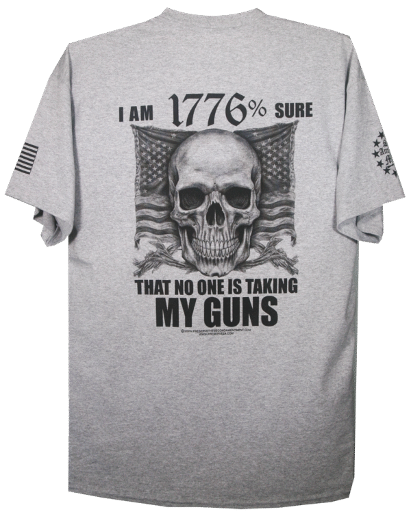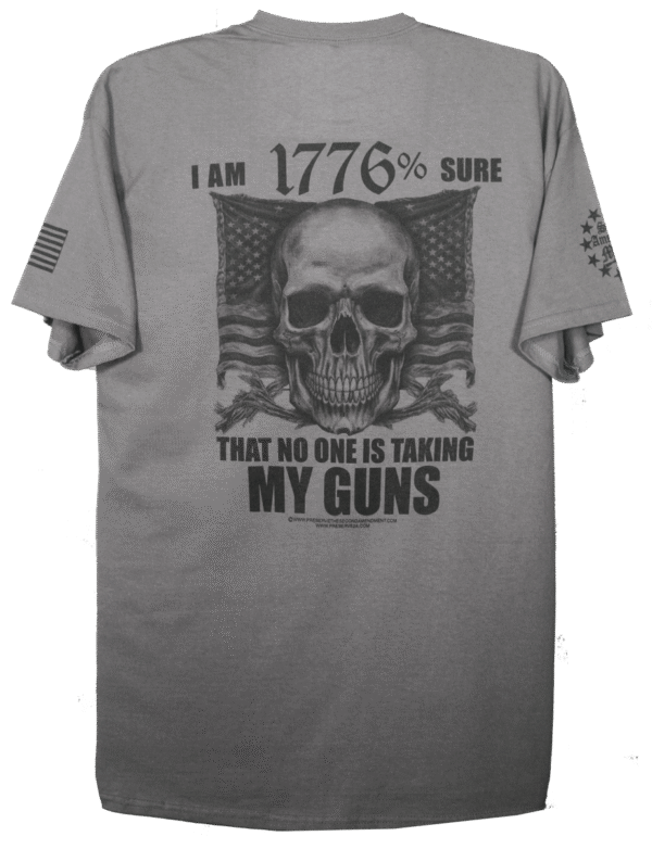 This design features a bold Skull with an American Flag banner design in the backround. The quote: “I’M 1776% SURE THAT NO ONE IS TAKING MY GUNS” is a statement most Second Amendment supporters feel strongly about. This is a right given to us in our Constitution that we will always defend.
