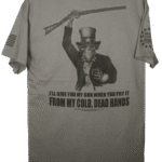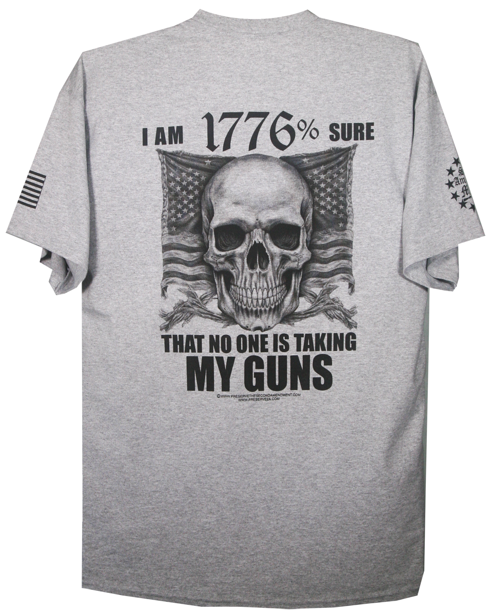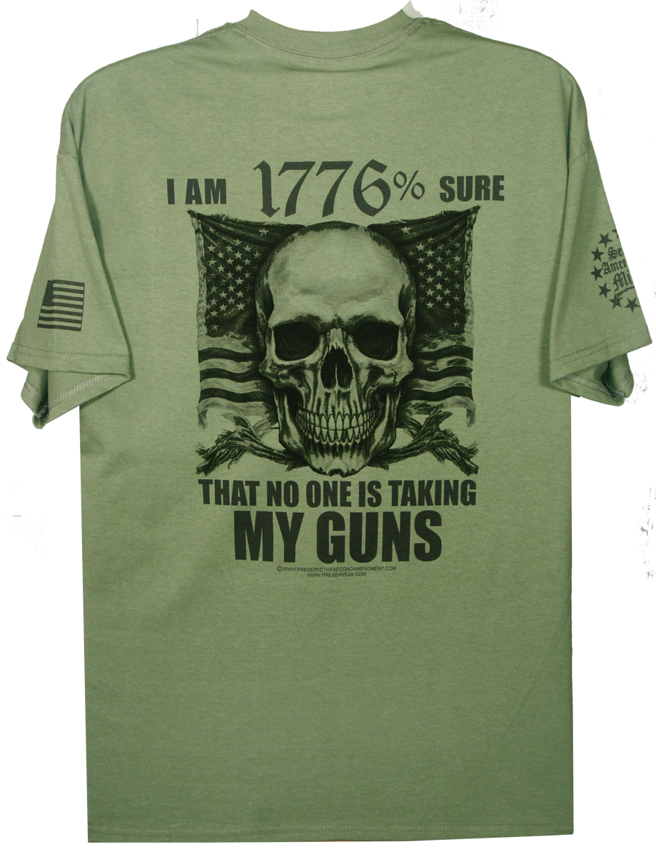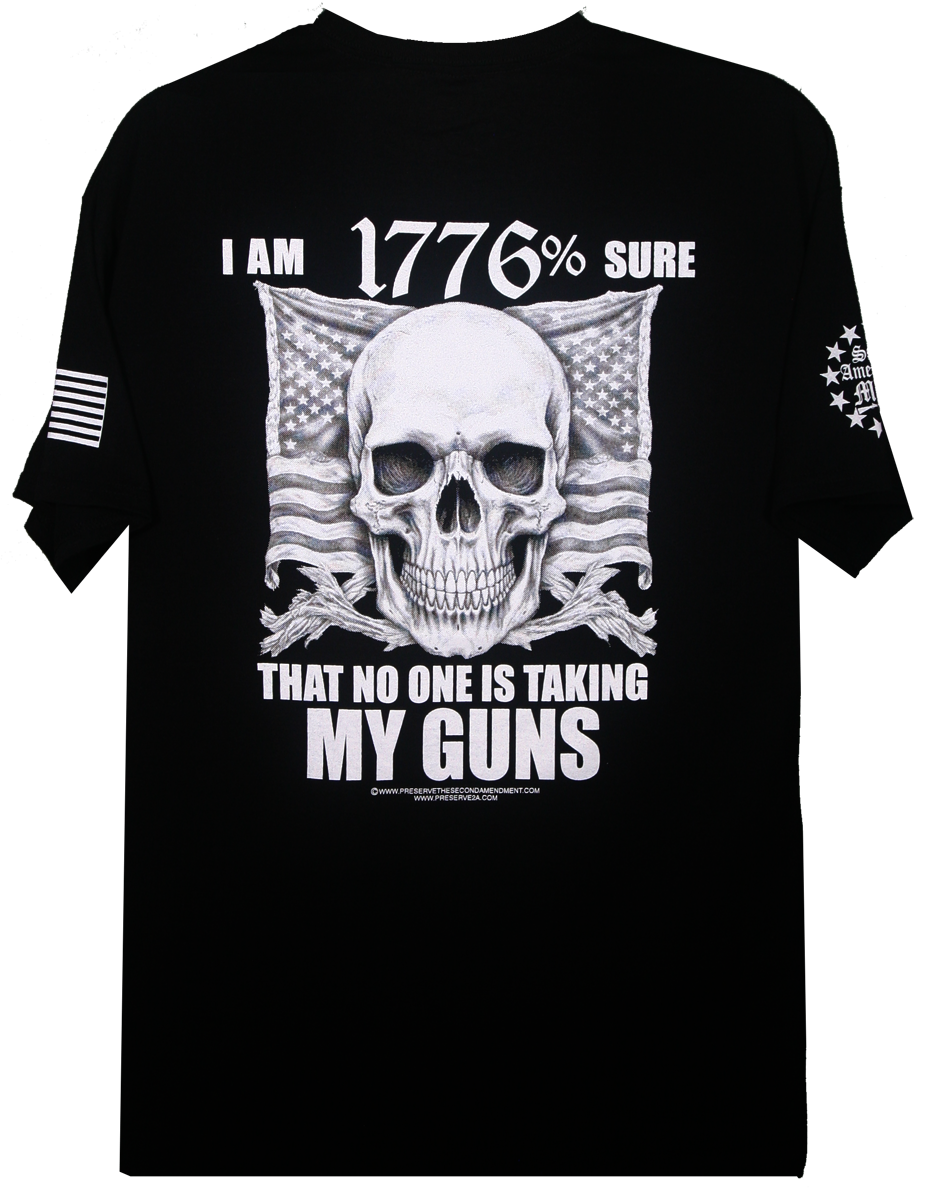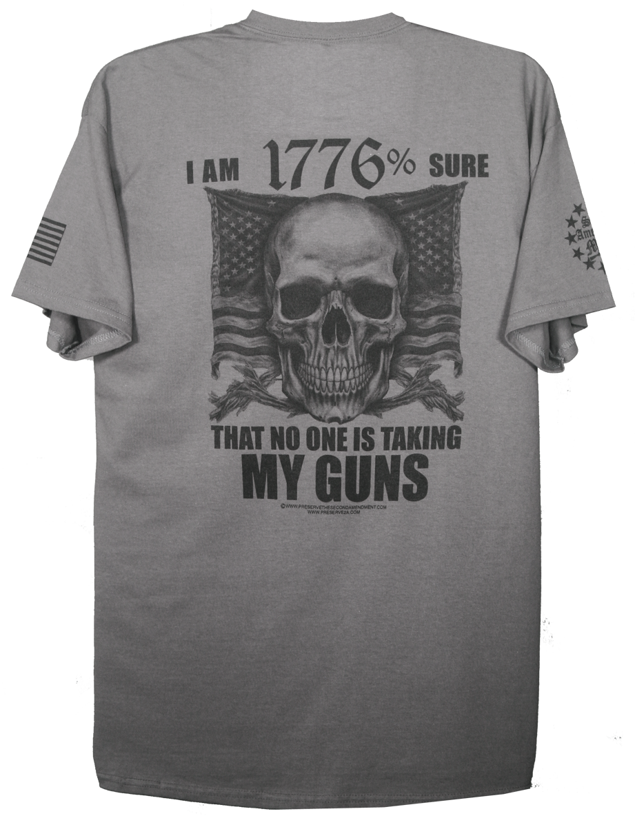 This design features a bold Skull with an American Flag banner design in the backround. The quote: “I’M 1776% SURE THAT NO ONE IS TAKING MY GUNS” is a statement most Second Amendment supporters feel strongly about. This is a right given to us in our Constitution that we will always defend.
