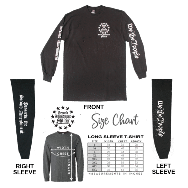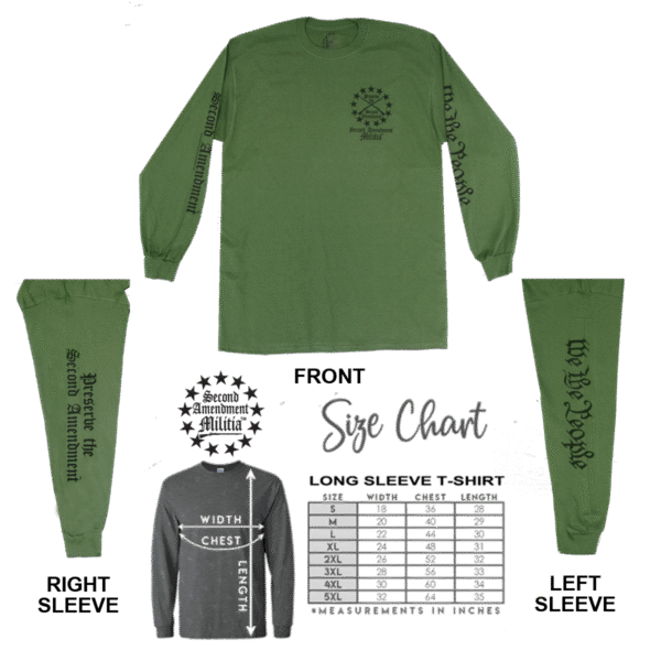 • Printed in Four Locations: Front, Back, and Both Sleeves, plus a printed neck label featuring the Second Amendment Militia logo.