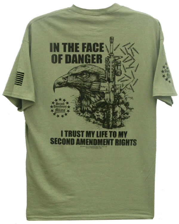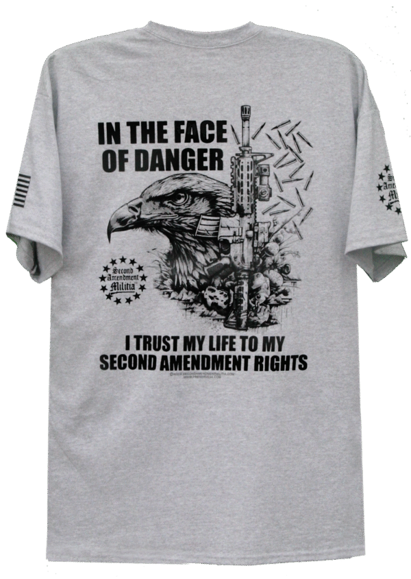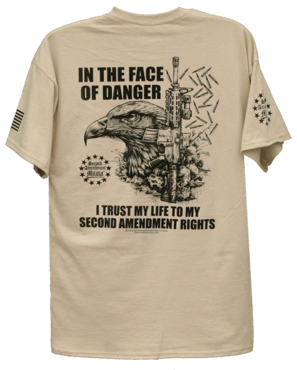 Beautiful and powerful graphics coupled with an excellent quote. The graphic features an AR style rifle ith a bold bald eage in the backround. Multiple rounds of .223/.556 are scattered on the right flank of the design. The quote of: “In The Face of Danger, I Trust My Life To My Second Amendment Rights” signifies that a person can defend himself by virtue of having Second Amendment rights. This is a right we must treasure, and protect.