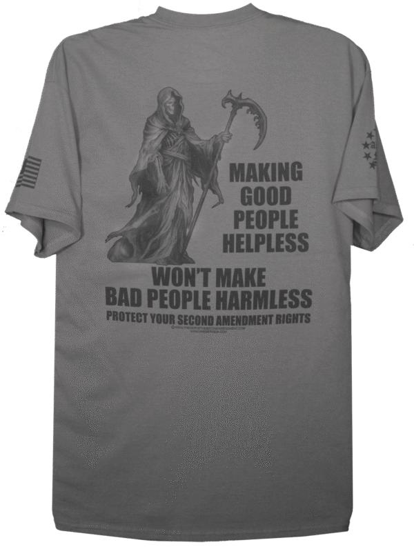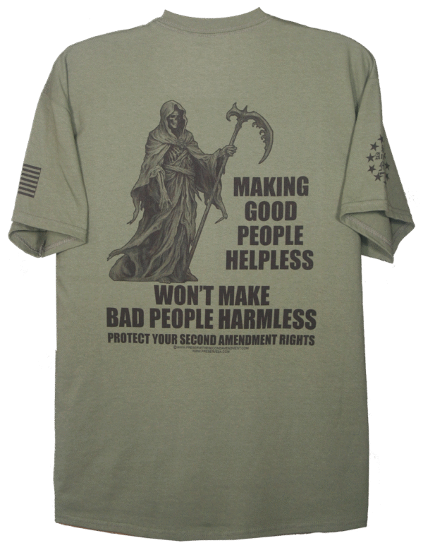 What message this t-shirt is trying to convey: that taking guns away from decent, law abiding citizens, will not make anyone any safer. In fact it will make them worse off because the “bad people”, will still have their guns. They will not give up their guns and as a result, they will be even more dangerous because the good people will have been disarmed and now unable to protect themselves or their families. That is why it is so important that we protect our right to bear arms.