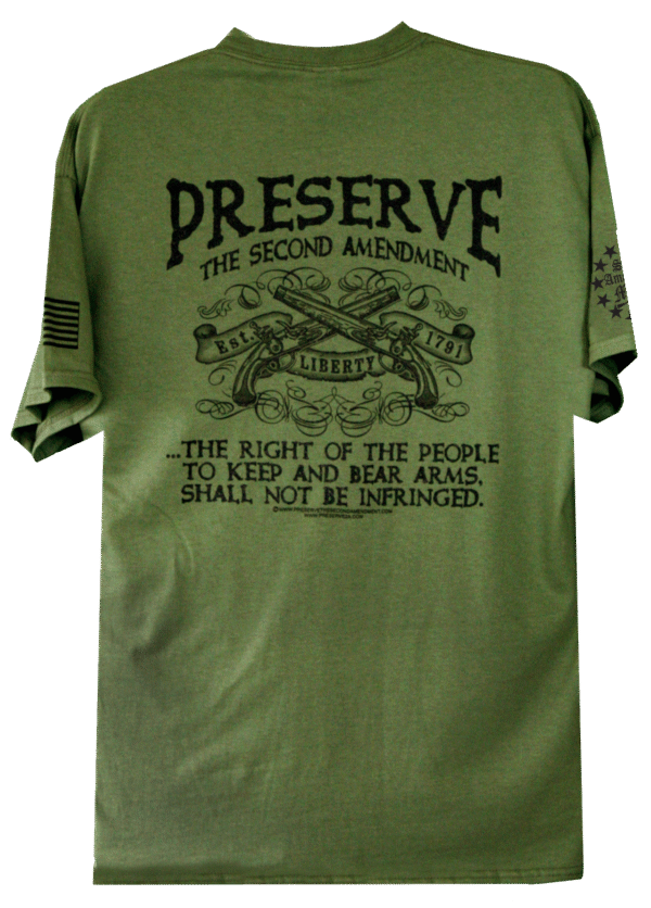 This T-Shirt features a creative crossed pistols design. The graphic has two crossed pistols, and contained within a banner are “Est. 1791”, the date the Second Amendment was ratified, as well as the word “LIBERTY”, and with an embellishment as a backround to the graphic. Above the graphic the Word: “Preserve” sits boldly and proud. Beneath it are the words: “THE SECOND AMENDMENT”. Below the graphic are the words: ” THE RIGHT OF THE PEOPLE TO KEEP AND BEAR ARMS SHALL NOT BE INFRINGED…”. Thee design displays the sentiment of The People at the time of the founding of our nation, and still rings true today amongst the Patriots who still believe in preserving and protecting the Second Amendment.