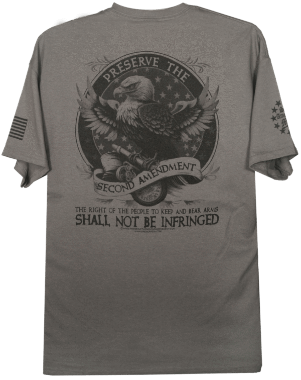 This design features our artists beautiful drawing of an American Bald Eagle within a shield logo of a field of stars, with “PRESERVE THE” arcing around the top of the shield and “SECOND AMENDMENT” within a banner at the bottom of the shield. Below this graphic are words from the Second Amentment: “THE RIGHT OF THE PEOPLE TO KEEP AND BEAR ARMS SHALL NOT BE INFRINGED”. A great t-shirt for defenders of the Second Amendment.