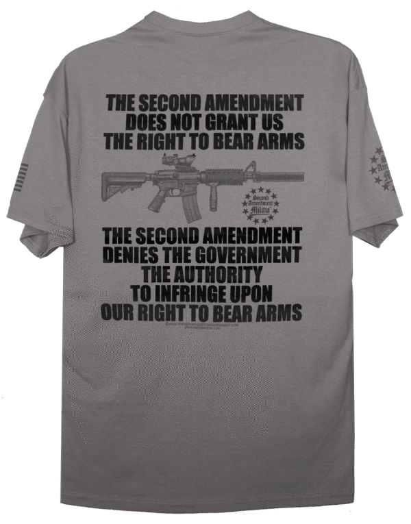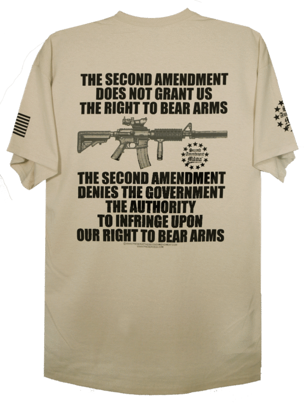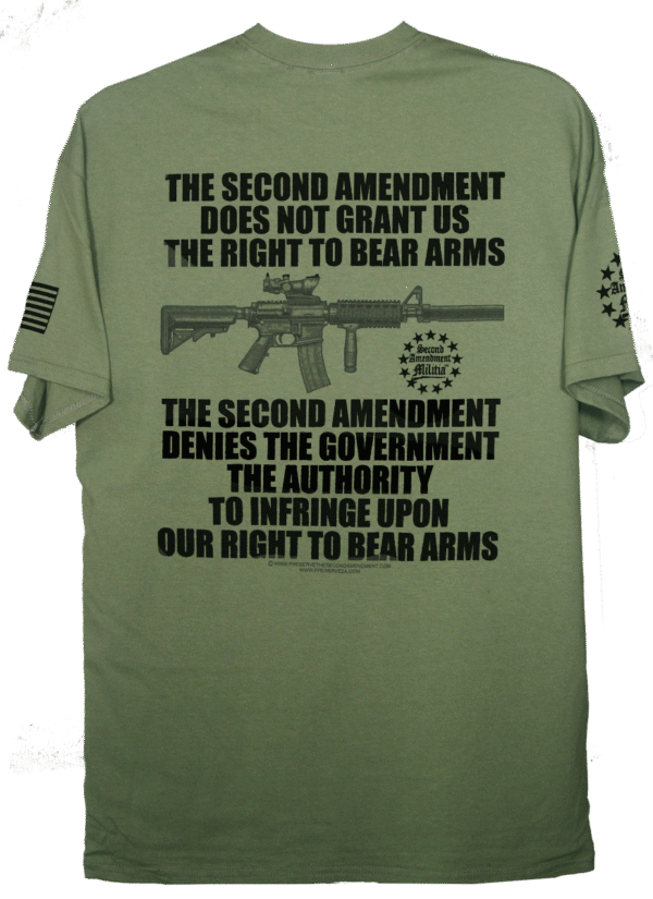 This T-Shirt tells it like it is. Simply put… The Second Amendment denies the Government the authority to Infringe Upon Our Right To Bear Arms. There is no more clear way to say it. The design Bold lettering and an AR style Rifle, and The Second Aendment Militia Logo.