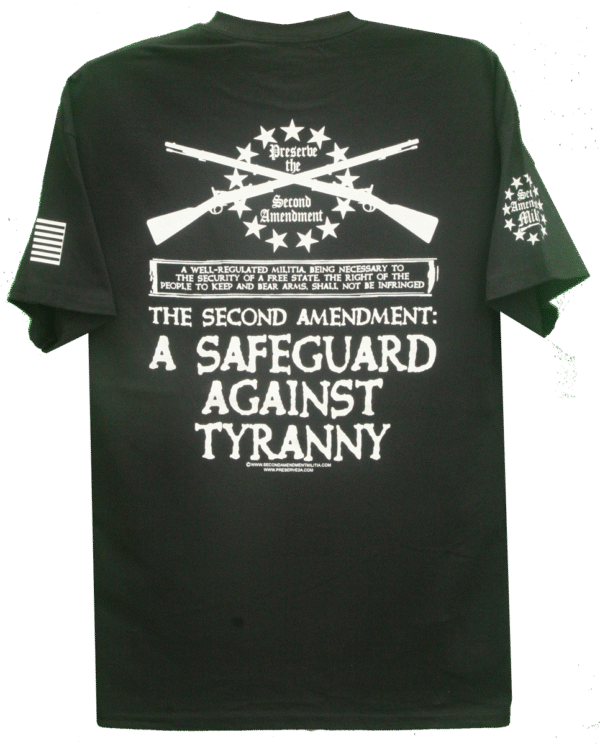 - Printed in 4 locations: Front left chest, back, and both sleeves, plus a printed neck label for comfort and features the Second Amendment Militia logo.