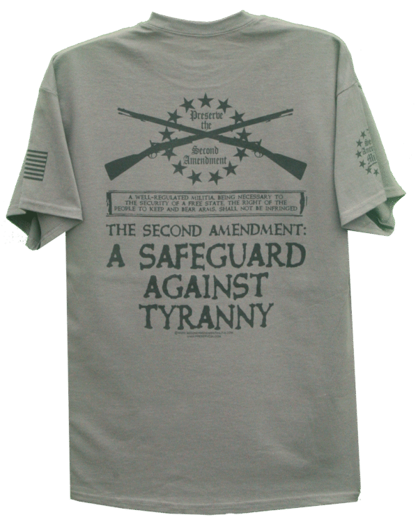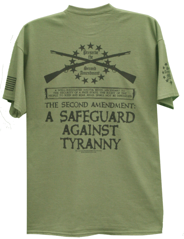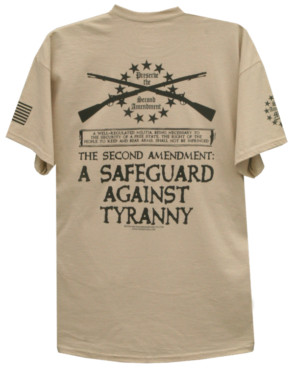 - Printed in Four Locations: Front, Back, and Both Sleeves, plus there is a printed neck tag for comfort which features the Second Amendment Militia Logo..
