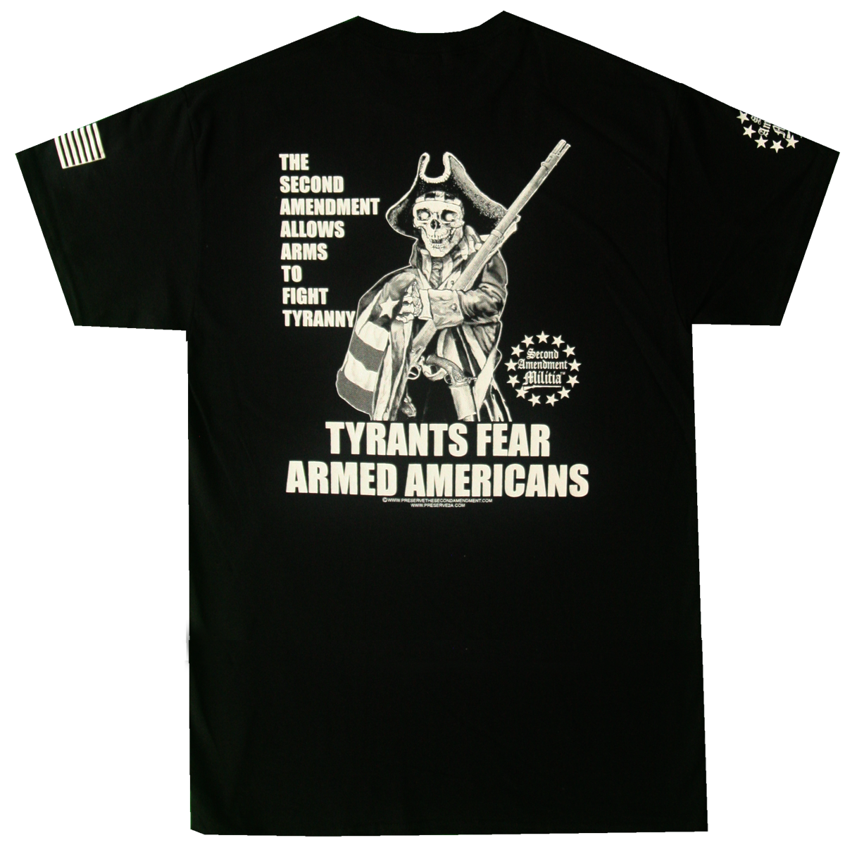 This t-shirt features a skeleton Patriot soldier draped in a Stars and Stripes Flag, while holding his musket, and has his flintlock pistol holstered by his side. On his right side are the words: “THE SECOND AMENDMENT ALLOWS ARMS TO FIGHT TYRANNY”. Below our patriot are the words: “TYRANTS FEAR ARMED AMERICANS”. Thanks to the rights given us by the Second Amendment we are able to fight Tyranny should it be necessary.