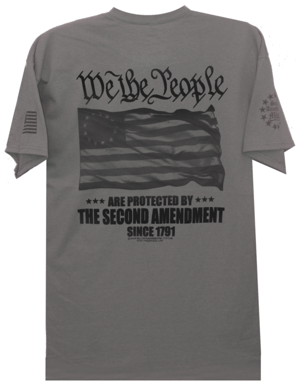 This design features an American 13 Star American flag often referred to as the Betsy Ross Flag. The design of the “Betsy Ross flag” conforms to the Flag Act of 1777, passed early in the American Revolutionary War, which merely specified 13 alternating red and white horizontal stripes and 13 white stars in a blue canton (rectangular emblem in the upper-left corner of a flag). The quote above and below this historical flas reads: “WE THE PEOPLEARE PROTECTED BY THE SECOND AMENDMENT SINCE 1791”.