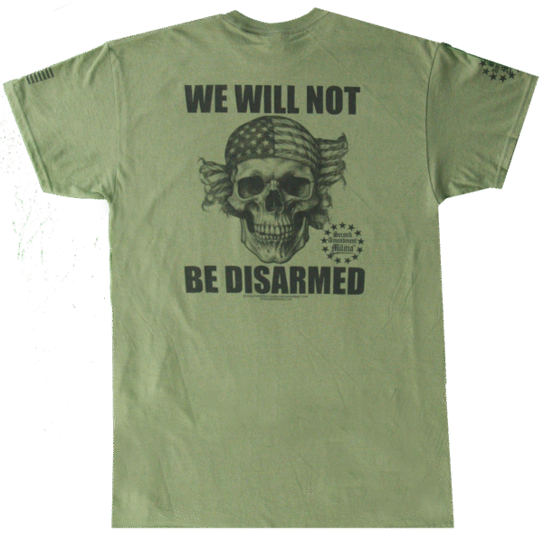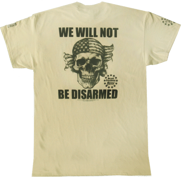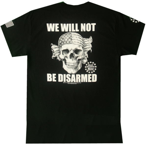 If you like the Second Amendment, Freedom, and Skulls then you should love this design. The graphic features a large Skull wearing a Patriotic Stars and Stripes bandana. The quote on the shirt says: “WE WILL NOT BE DISARMED”. It also features the Second Amendment Militia Logo. This t-shirt simply tells it like it is in no uncertain terms!