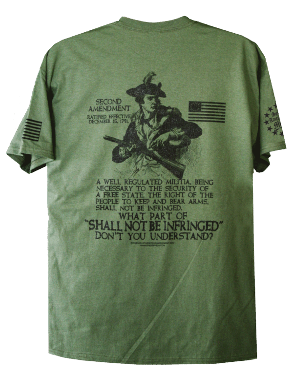 A excellent graphic of a traditional period Colonial Patriot Soldier adding gun powder to his musket coupled with all 27 words of the Second Amendment followed by: “WHAT PART OF “SHALL NOT BE INFRINGED” DON’T YOU UNDERSTAND? Design Includes Date of Ratification of the Second Amenment and a period 13 Star American flag, often referred to as the Betsy Ross Flag. A beautiful T-Shirt with an important message.