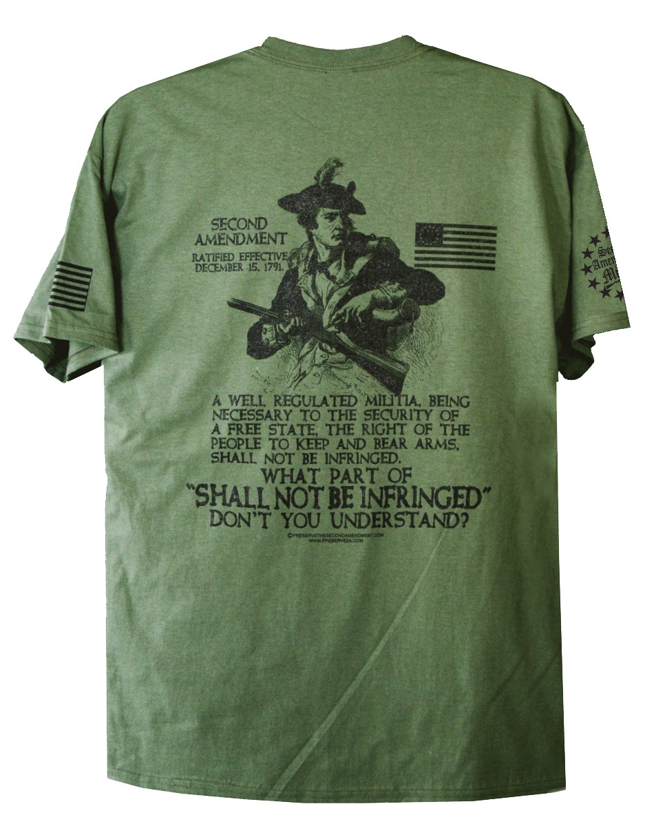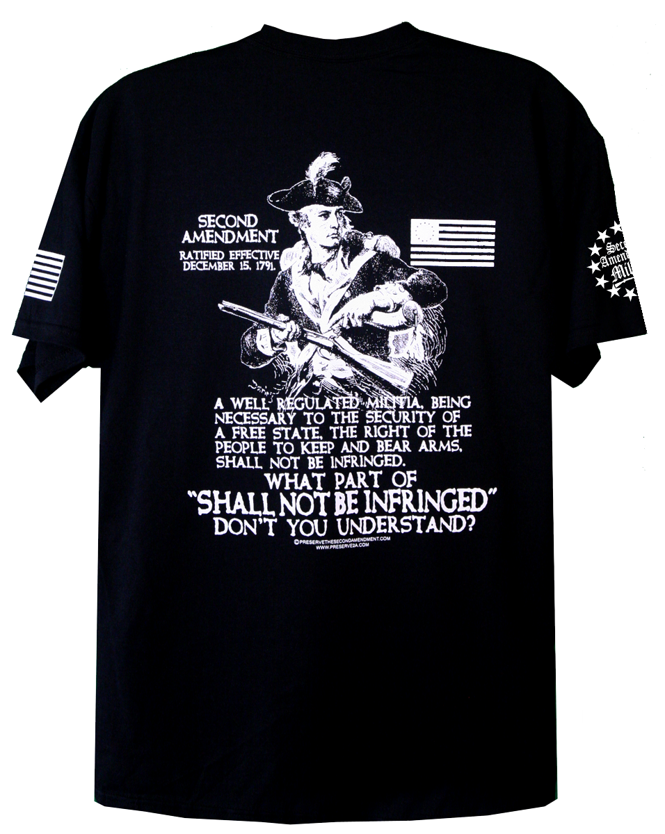 • PRINTED IN FOUR LOCATIONS: FRONT, BACK, AND BOTH SLEEVES, (PLUS A PRINTED NECK LABEL FOR COMFORT, FEATURING THE SECOND AMENDMENT MILITIA LOGO)