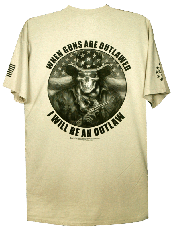 Here we have another skeleton Patriot wearing a patriotic cowboy hat with handgun in hand, with a stars and stripes backround. He defiantly holds a handgun in his hand at the ready to defend his Second Amendment rights. As the t-shirt says: “When Guns Are Outlawed, I Will Be An Outlaw”. He, like many, is not willing to give up his Constitutional right to bear arms!